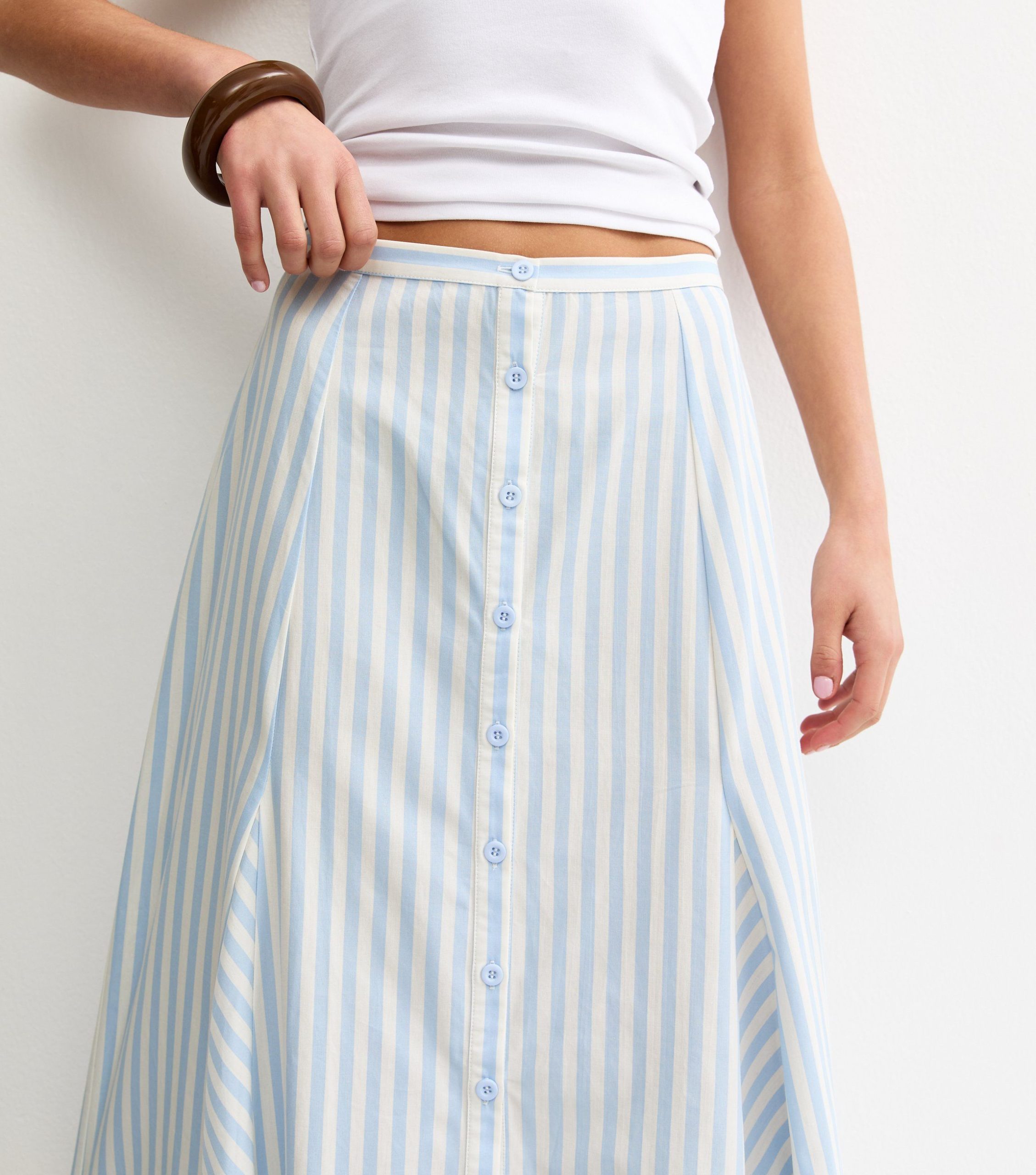 This full pleated midi skirt is designed in a breezy blue stripe pattern that is perfect for sunshine dressing. The poplin woven material has a casual elegance that will suit multiple occasions.
