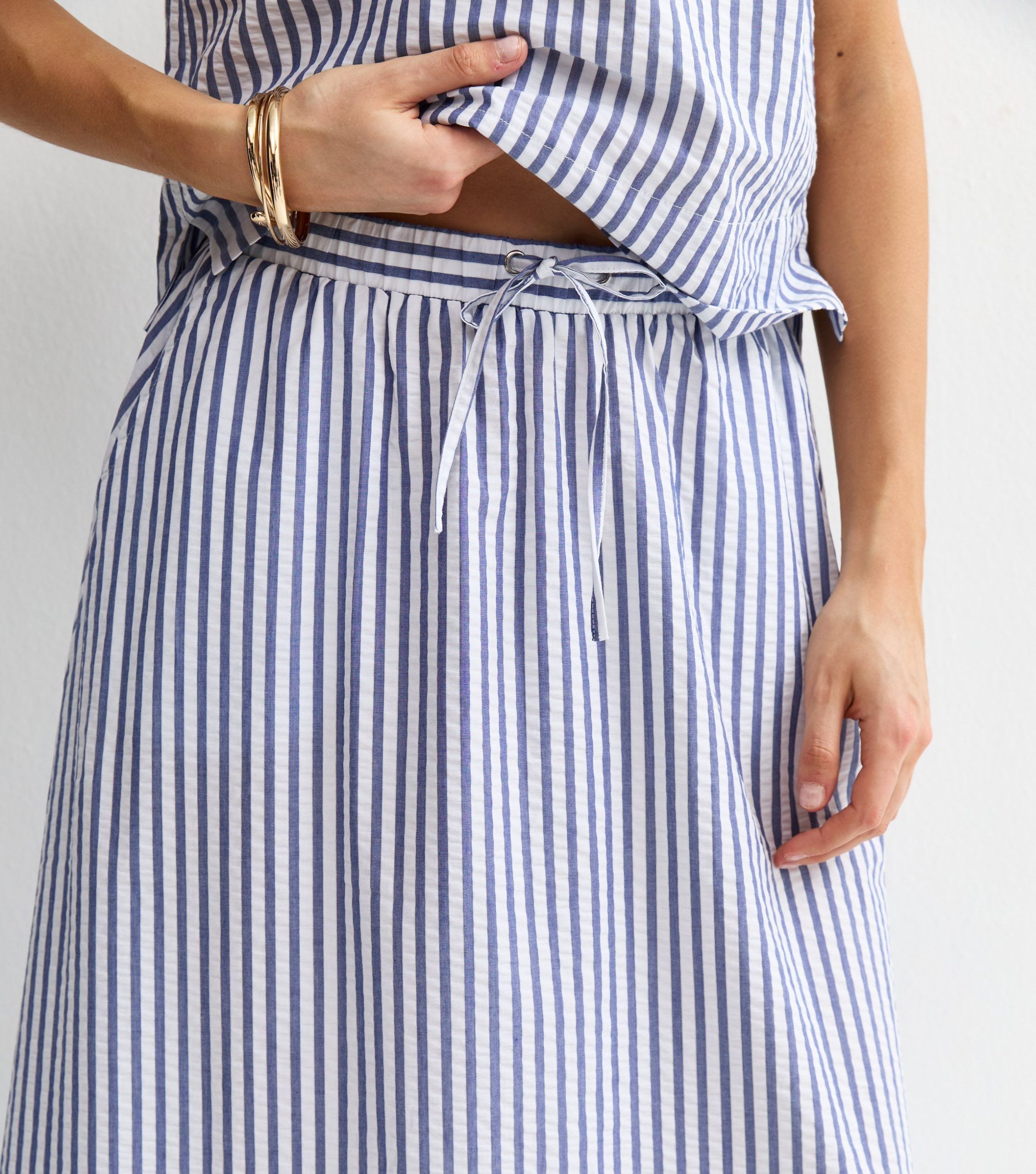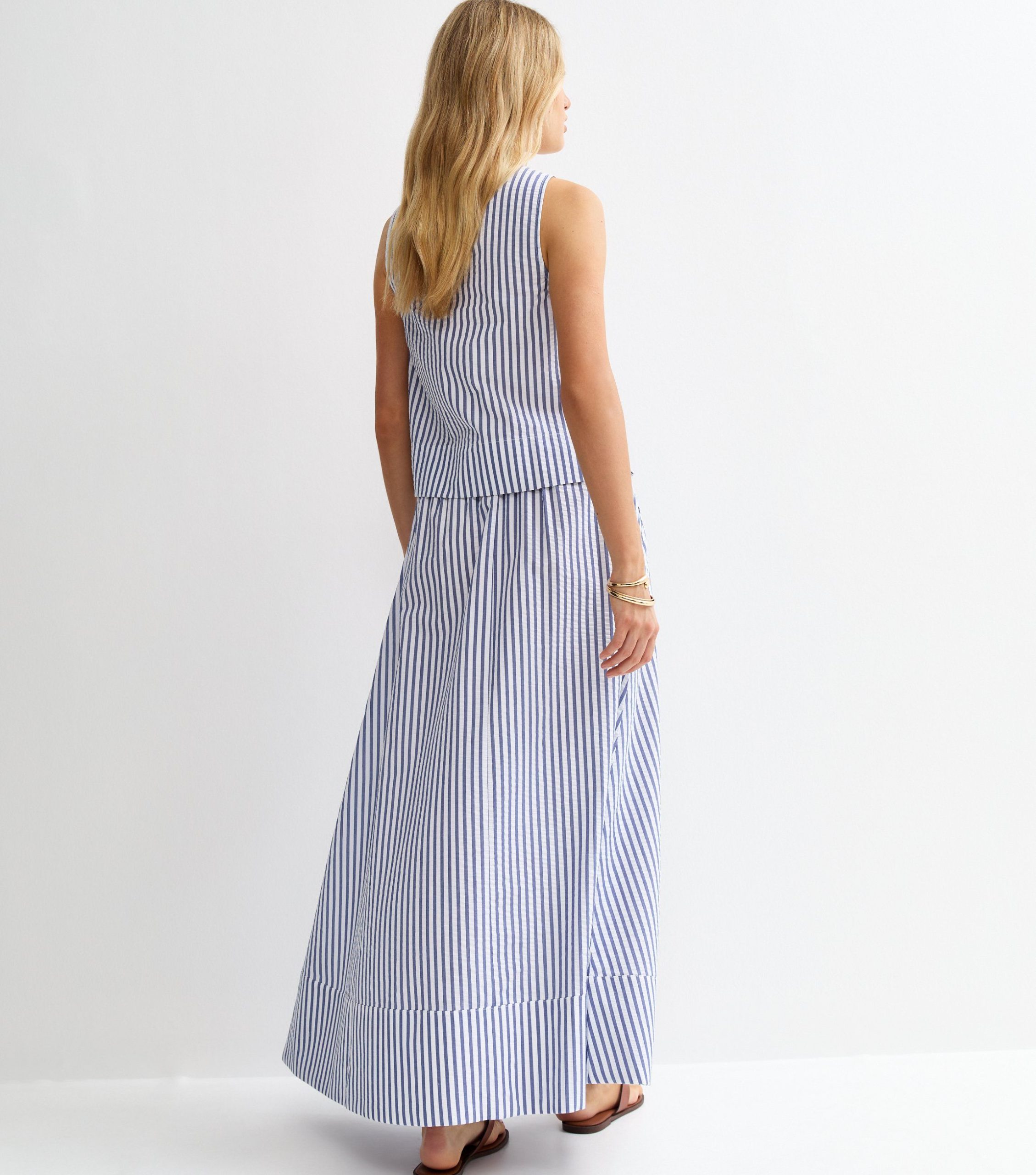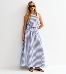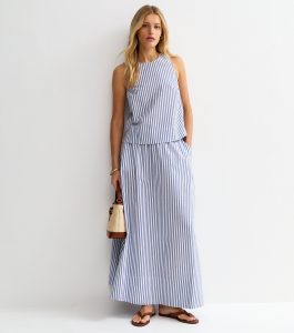 Long and flowy with a circle cut, this blue maxi skirt was designed for warm days. It’s made from striped seersucker fabric and has a comfy drawstring waist.