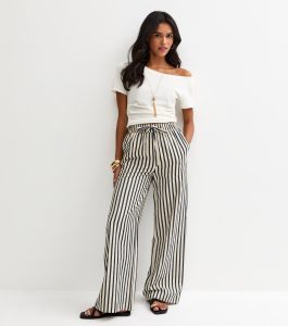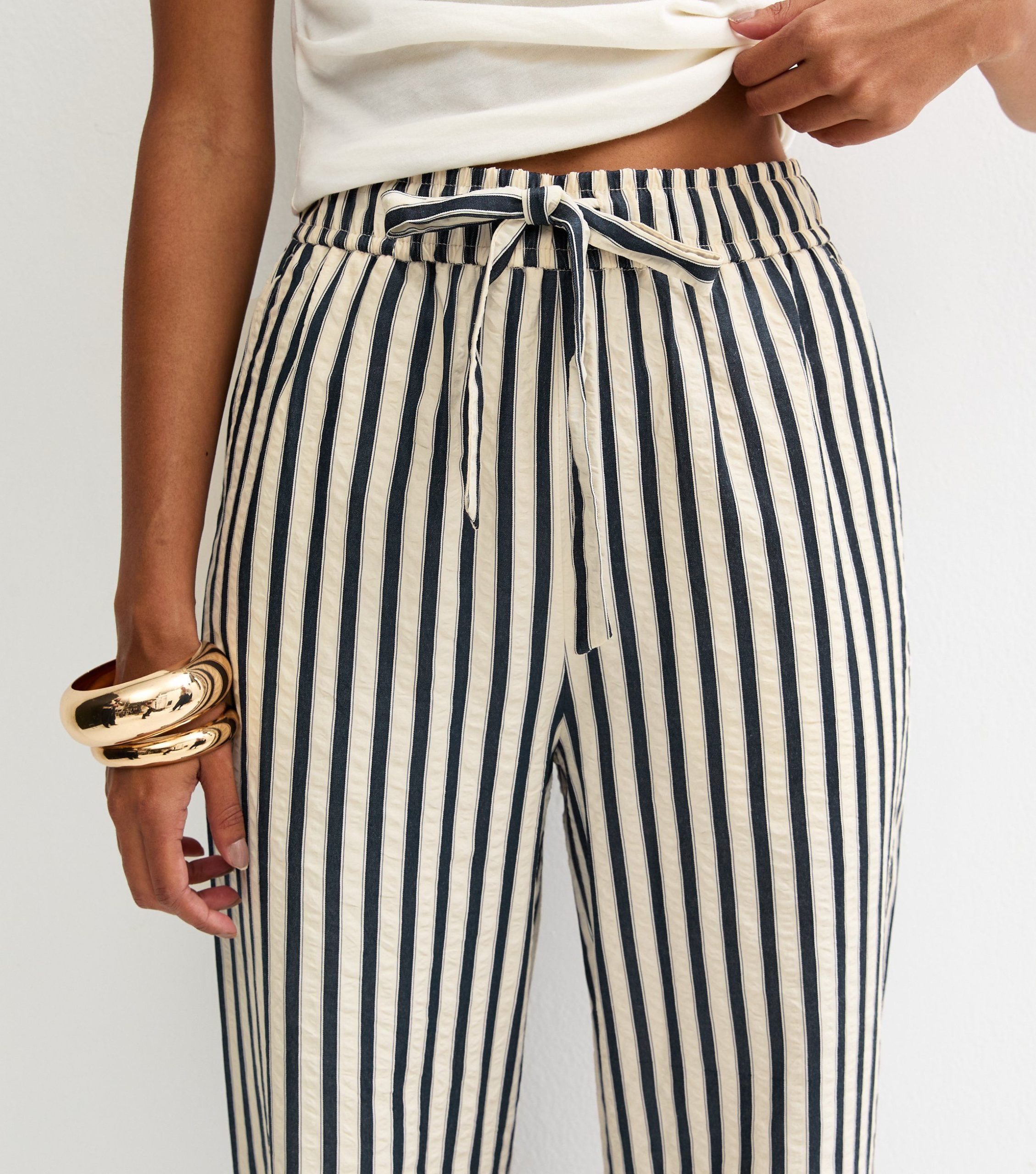 Perfect with plain tops and tees, these blue striped trousers bring a bold energy to any look. They’re made from woven seersucker with a crinkled texture and have a stretchy drawstring waist.