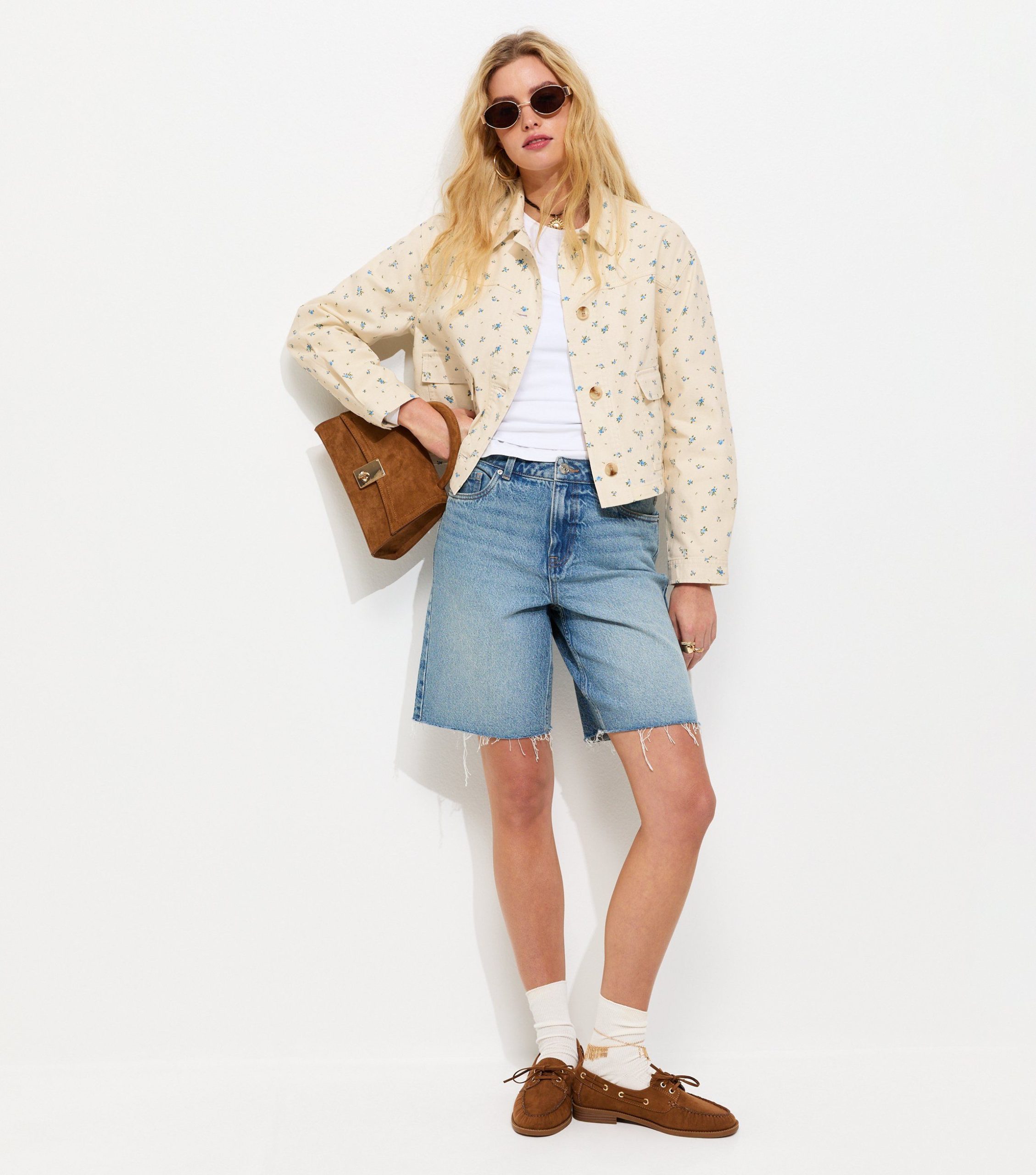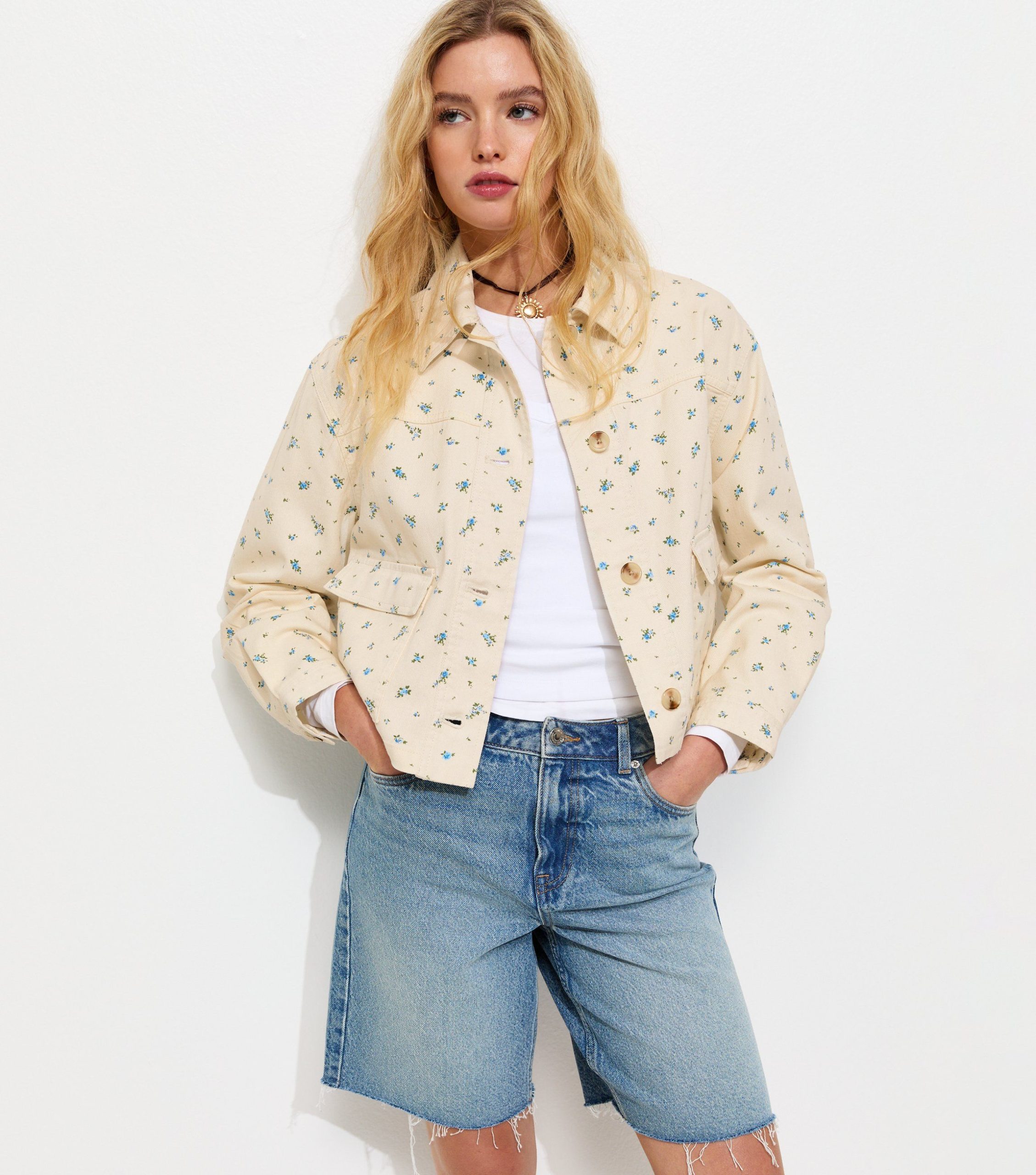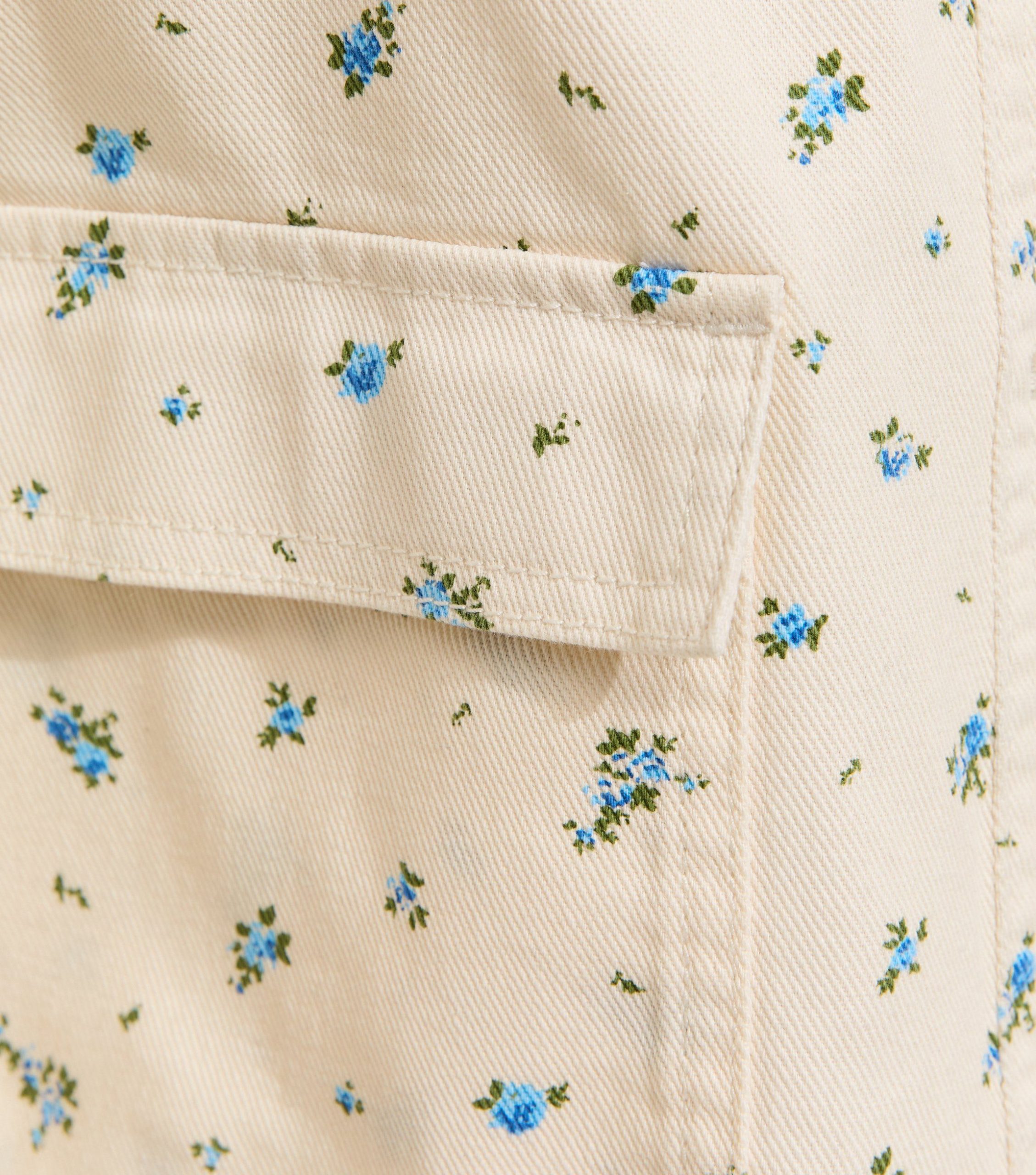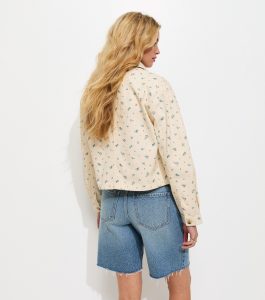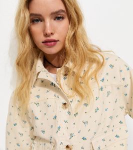 This cream shacket offers a laid-back look that’s perfect for sunny days. It’s made from cotton twill and is covered in a sweet ditsy floral print.