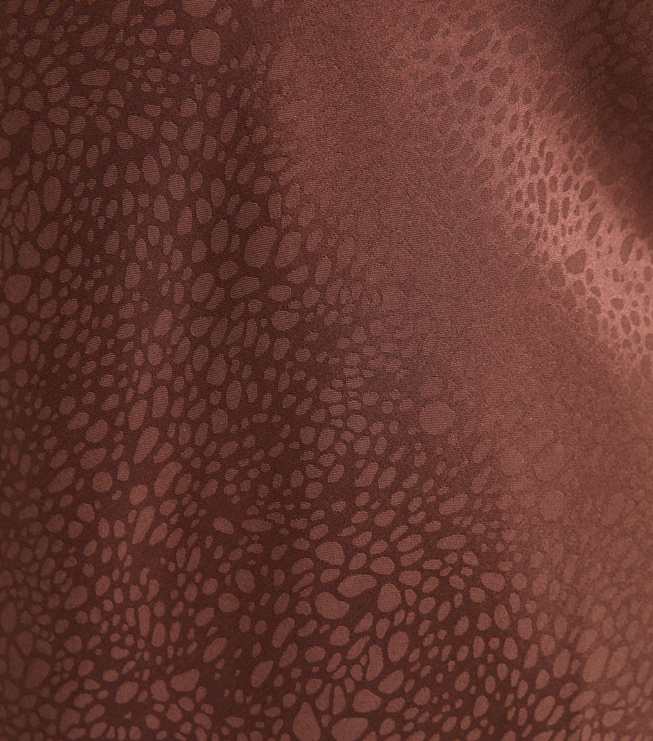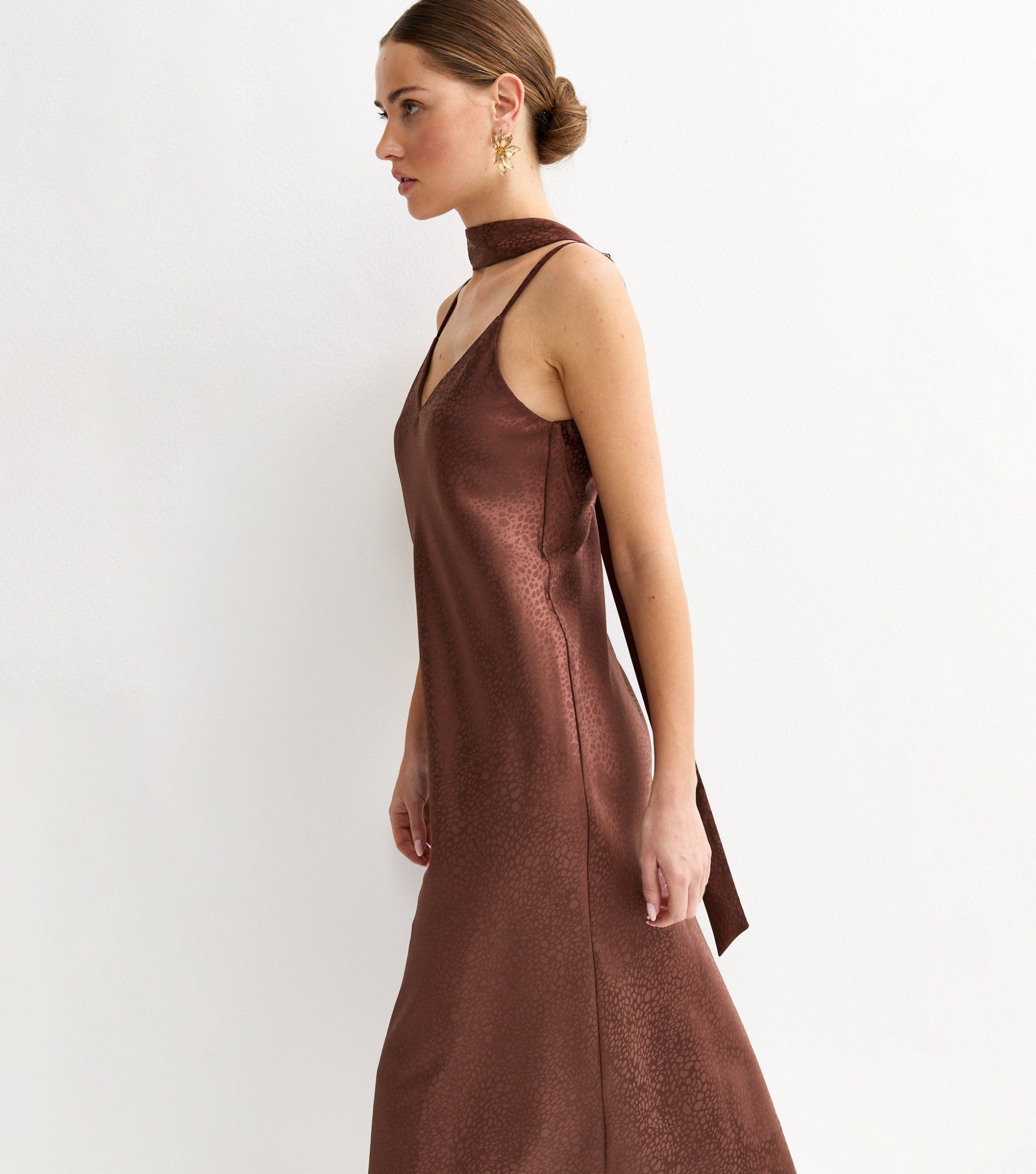 This satin midi dress is an elegant choice in a rich dark brown shade. Perfect for weddings and special occasions, it has a flattering A-line silhouette and is topped off with a flowing scarf.