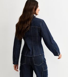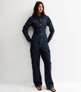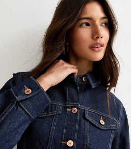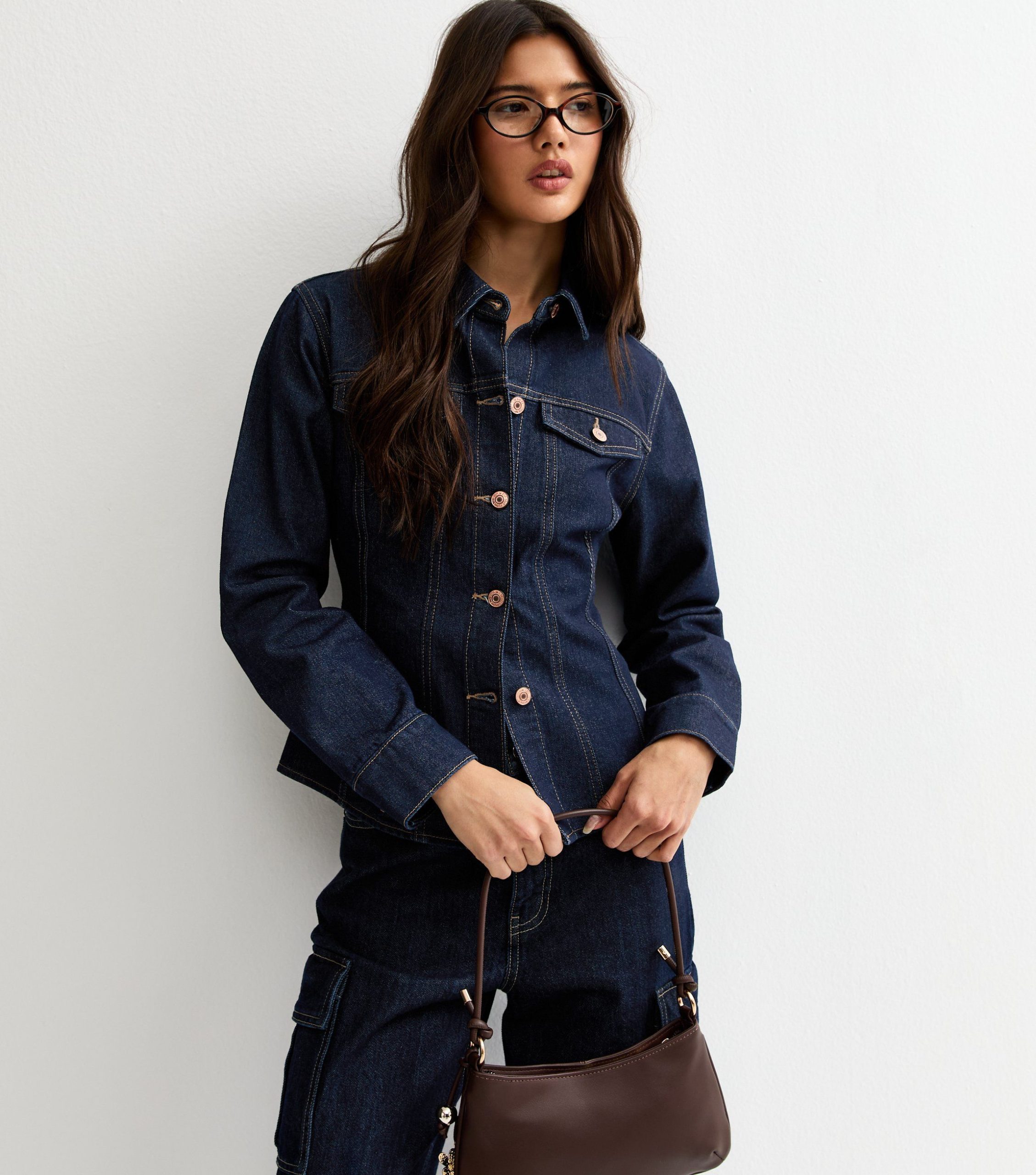 This denim jacket has a cinched shape that flatters your figure making outerwear versatile for styling wherever. In a dark indigo wash, this jacket has a collared neck and buttons through.
