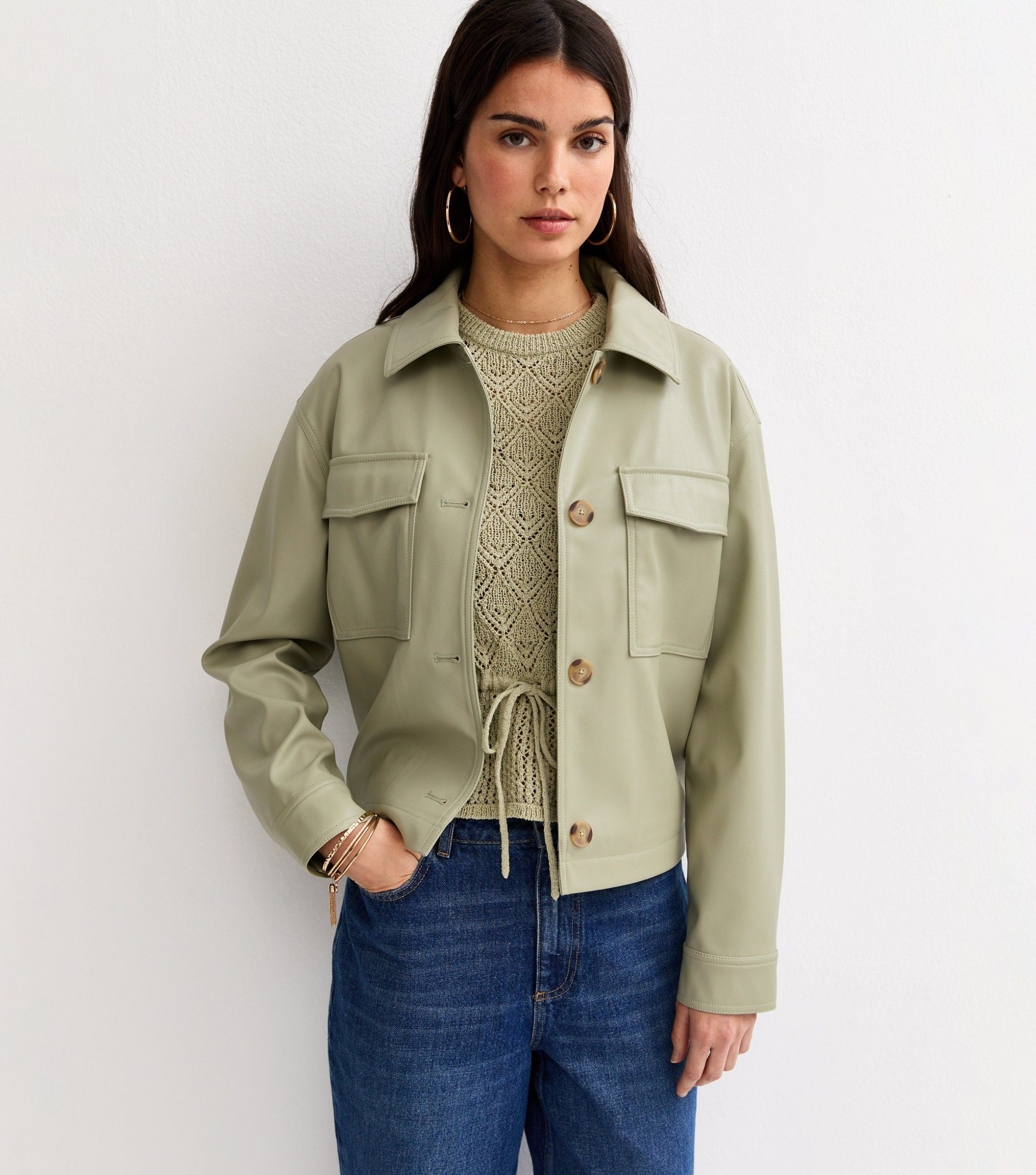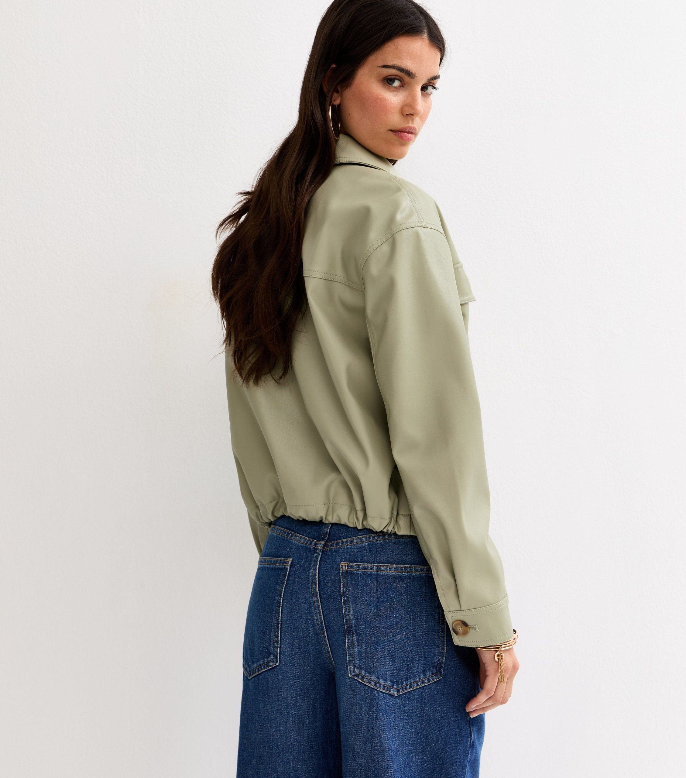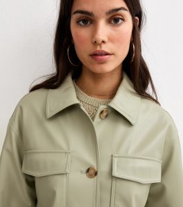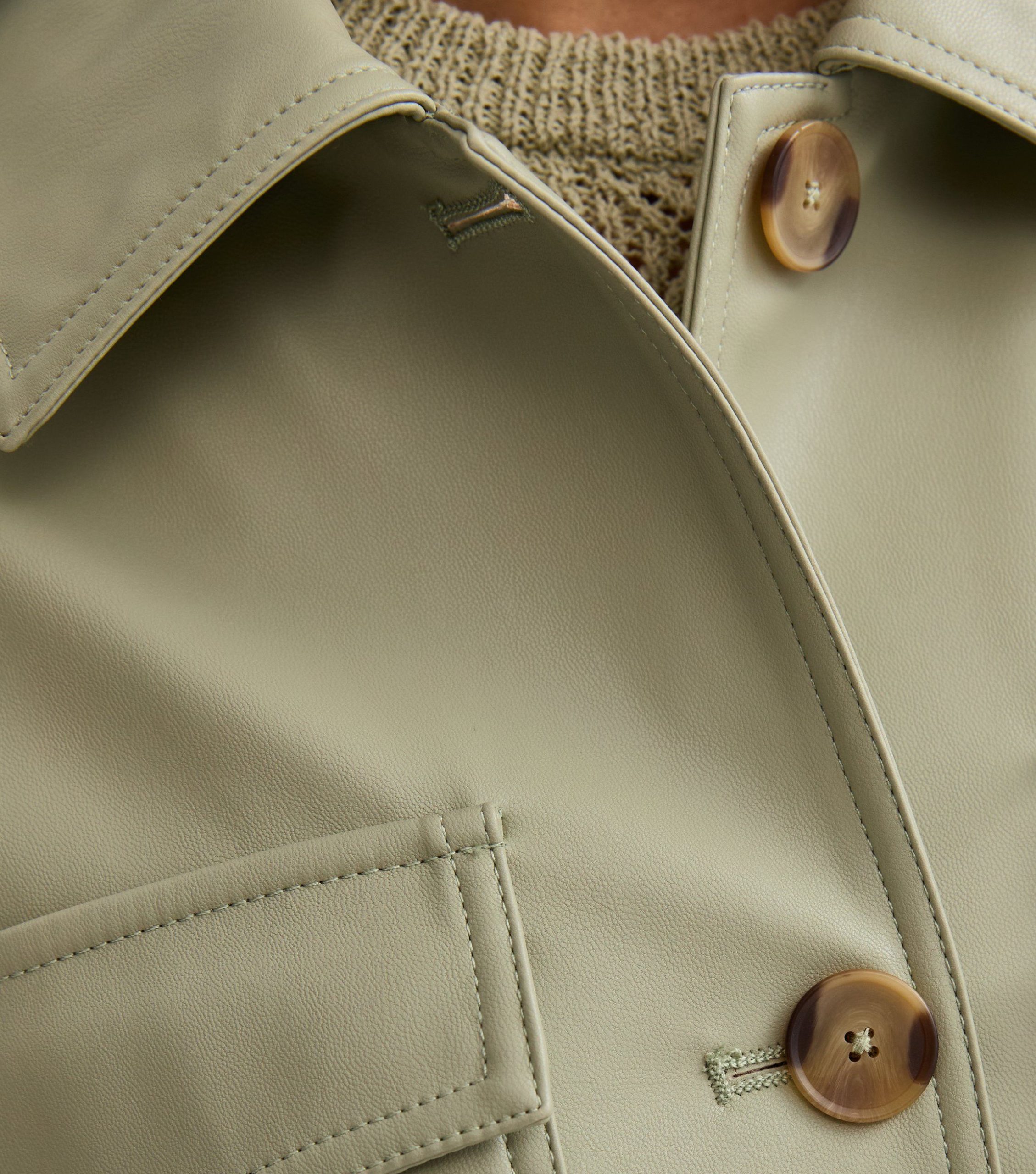 You can pop this light khaki faux leather jacket over all your favourite tops and dresses this season. It features a relaxed cut and dropped shoulders for easy layering. This piece is registered by The Vegan Society and is completely animal free.