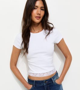 This white baby tee offers stretchy fit that hugs you closely. Perfect for layering, allow the lace hem to peak out under cropped layers.