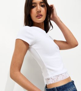 This white baby tee offers stretchy fit that hugs you closely. Perfect for layering, allow the lace hem to peak out under cropped layers.