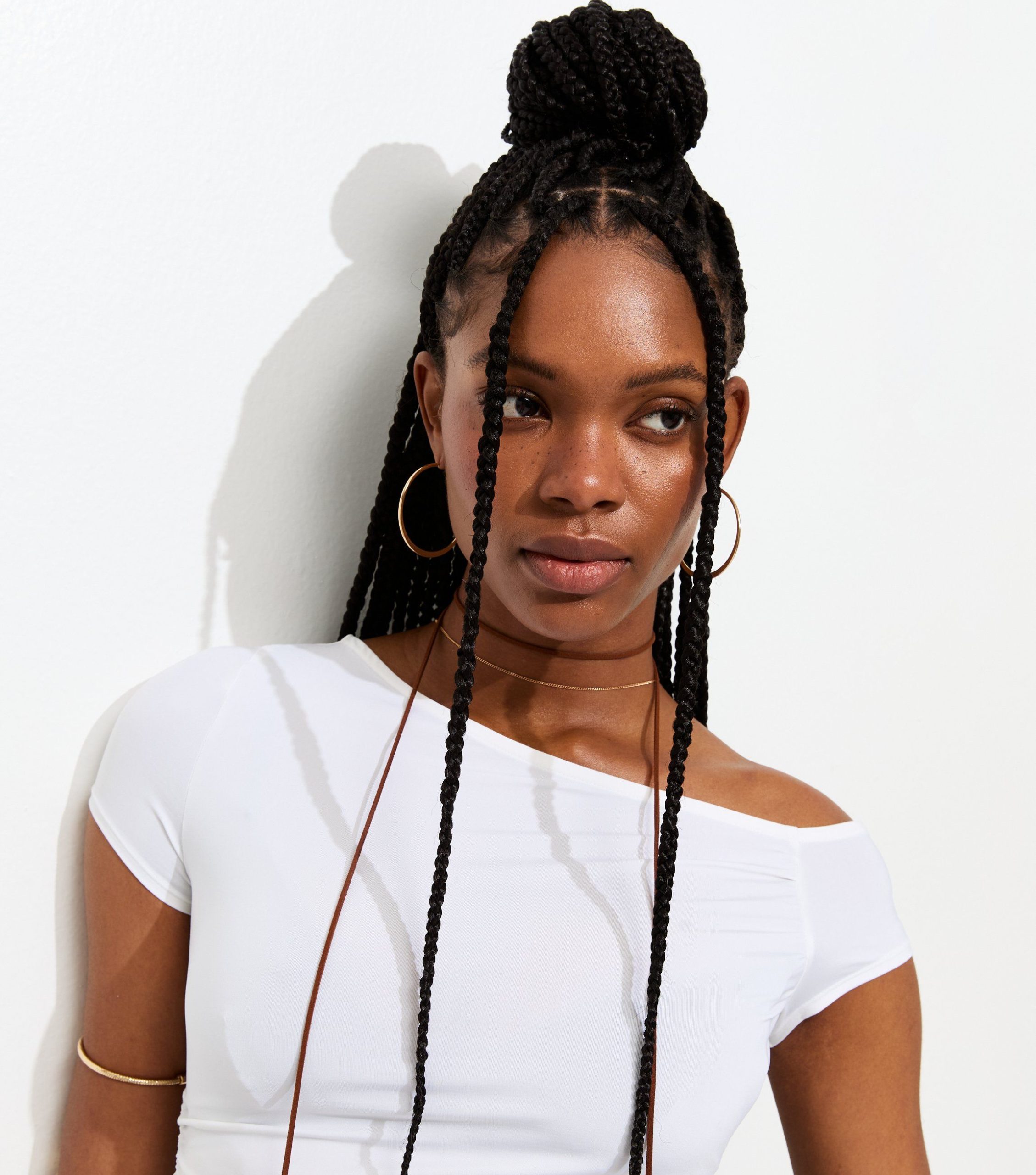Draping off the shoulder for a laid-back mood, this white top has a slender silhouette gently hugging your figure and ruched sides.